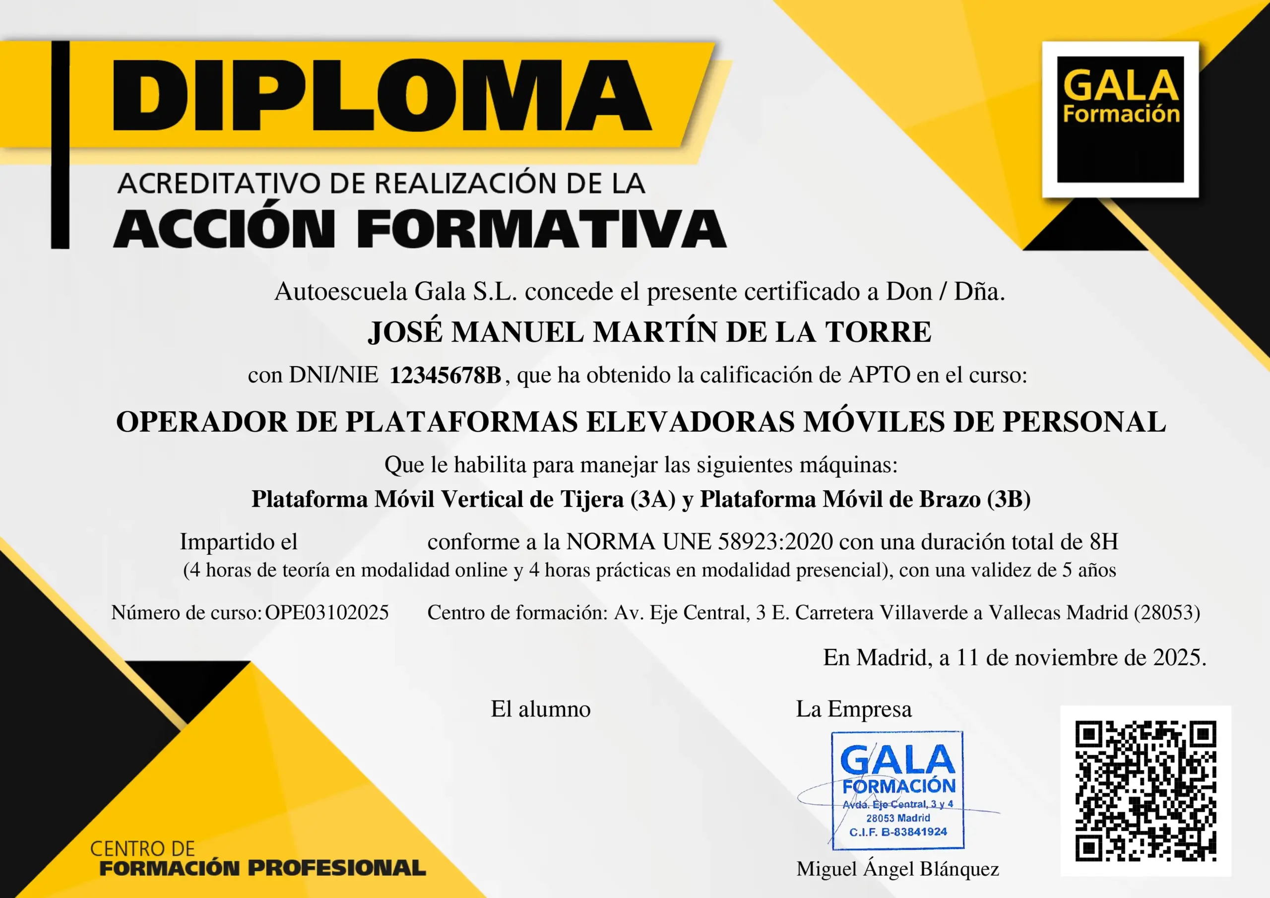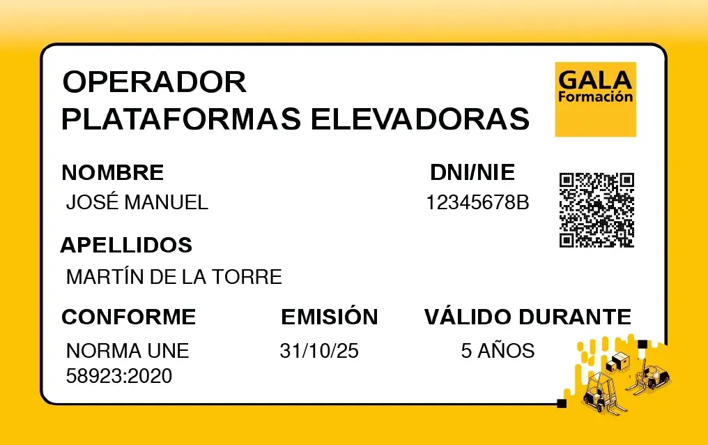 Obtén tu Carnet Acreditativo y Diploma de Plataformas Elevadoras UNE de forma digital una vez finalizado el curso en GALA Formación.